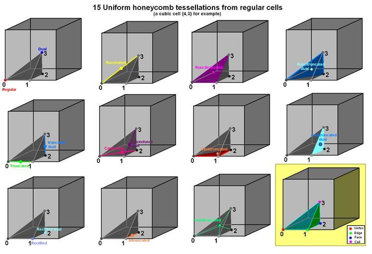 Keywords: Uniform honeycomb truncations.png en wikipedia 2011 October 19 Image Polychoron_truncation_chart png into a 3d cell According to Norman Johnson the fundamental cutting operations are Truncation - cuts vertices truncating polygons and higher Cantellation - cuts edges beveling polyhedra and higher Runcination - cuts faces planing polychoron and higher Stericating - cuts cells soliding 5-polytopes and higher Tom Ruen 08 07 1 August 2006 UTC 2006-7-14 Own <br />Transferred from http //en wikipedia org en wikipedia Tomruen at http //en wikipedia org en wikipedia en wikipedia Tomruen Original upload log page en wikipedia Uniform_honeycomb_truncations png 2006-07-14 19 54 Tomruen 1900×1300 129413 bytes <nowiki></nowiki> Cube Tetrahedra |