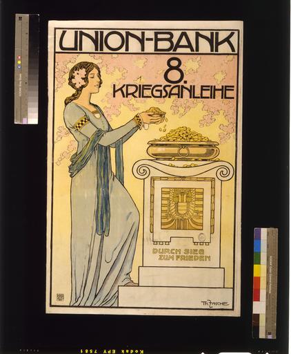 Keywords: Union Bank, 8th War Loan; Peace Through Victory WDL249.png Artwork ru Фаше Томас fr Fasche Thomas en Fasche Thomas zh 托马斯 范 齐 pt Fasche Thomas ar فاشي توماس es Fasche Thomas ru Юнион-Банк 8-й военный заем; и благода я победе fr Union Bank  8ème Prêt de guerre ; la paix par la victoire en Union Bank 8th War Loan; Peace Through Victory zh 联合银行,第8次战争贷款; 利换 的和平 pt Union Bank Empréstimo da Oitava Guerra; Paz Através da Vitória ar بنك الاتحاد، القرض الحربي الثامن؛ السلام من خلال الانتصار ru В годы Пе вой ми овой войны все участвовавшие в ней ст аны использовали плакаты как с едство мобилизации усилий своего населения нап авленных на выполнение военных задач ст аны Данный плакат выпущенный в Вене в 1918 году еклами ует восьмой военный заем объявленный Авст о-Венг ией  главным военным союзником Ге мании а нем изоб ажена молодая женщина п иносящая чашу наполненную монетами на алта ь ук ашенный ге бами Авст ии Плакат на исовал Томас Фаш Он был авто ом нескольких плакатов в емен Пе вой ми овой войны  хотя о нем мало что известно <br>Алта и; онеты; Облигации и фонды военных лет; Женщины; Пе вая ми овая война 1914-1918 гг fr Durant la Première guerre mondiale toutes les parties ont utilisé des affiches comme outils pour mobiliser leurs populations en faveur de l'effort de guerre Cette affiche publiée à Vienne en 1918 est une publicité pour le huitième emprunt de guerre levé par l'Autriche-Hongrie le principal allié de l'Allemagne dans la guerre Elle représente une jeune femme offrant une coupe de pièces de monnaie à un autel décoré de l'armoirie autrichienne L'artiste est Thomas Fasche qui a créé plusieurs autres affiches de la Première guerre mondiale mais au sujet duquel peu est connu <br>Autels; Pièces; Fonds et obligations de guerre; Femmes; Guerre mondiale 1914-1918 en In World War I all sides used posters as tools to mobilize their populations for the war effort This poster published in Vienna in 1918 is an advertisement for the eighth war loan being raised by Austria-Hungary Germany s chief ally in the war It shows a young woman offering a bowl of coins at an altar decorated with the Austrian coat of arms The artist was Thomas Fasche who created several other World War I posters but about whom little is known <br>Altars; Coins; War bonds and funds; Women; World War 1914-1918 zh 第 次世界大战 间,各方都使用海报 为动员民众的工具 这幅 1918 年 维也纳出版的海报是奥 利-匈牙利(德国的主要战争盟友)募集第八次战争公 的 份广告 它描绘的是 位年轻的妇女正 向饰 奥 利纹章图案的祭 上奉献 碗硬币 该海报的创 叫托马斯·法 ,他还创 了其他几幅 战海报,但目前对其生平情况知之甚少 <br>祭 ; 硬币; 战争 券和基金; 妇女; 第 次世界大战,1914-1918 年 pt Na 1ª Guerra Mundial todos os lados utilizavam cartazes como ferramentas para mobilizar as populações para o esforço de guerra Este cartaz publicado em Viena em 1918 é um anúncio do oitavo debênture de guerra sendo fornecido pela Áustria-Hungria  principal aliado da Alemanha na guerra Mostra uma jovem mulher ofertando um vaso de moedas em um altar decorado com o brasão de armas austríaco O artista era Thomas Fasche que criou vários outros cartazes da 1ª Guerra Mundial mas sobre os quais pouco se sabe <br>Altares; Moedas; Títulos e fundos de guerra; Mulheres; Guerra Mundial 1914-1918 ar استخدمت كل الأطراف في الحرب العالمية الأولى الملصقات لحشد جهود شعوبها لصالح الحرب هذا الملصق الذى نشر في فيينا في عام 1918 عبارة عن دعاية لقرض الحرب الثامن الذي تجمعه النمسا-المجر، حليفة ألمانيا الرئيسية في الحرب فهو يبين امرأة شابة تقدم وعاء من النقود المعدنية في مذبح مزين بالشعار النمساوي الفنان هو توماس فاشي الذي ابتدع العديد من ملصقات الحرب العالمية الأولى ولكن لا يعرف عنه سوى القليل <br>المذابح; العملات; سندات وصناديق دعم الحرب; النساء; الحرب العالمية، 1914-1918 es Durante la Primera Guerra Mundial todos los bandos se sirvieron de carteles para movilizar a sus poblaciones para obtener la victoria Este cartel publicado en Viena en 1918 es un anuncio para la octava recaudación para la guerra llevado a cabo por el imperio Austrohúngaro el principal aliado de Alemania en la guerra Muestra a una mujer joven ofreciendo un tazón con monedas en un altar decorado con el escudo de armas austríaco El artista fue Thomas Fasche quien creó varios carteles sobre la Primera Guerra Mundial pero del cual se sabe muy poco <br>Altares; Monedas; Bonos y fondos de guerra; Mujeres; Guerra Mundial 1914-1918 1918 ru Эстампы фотог афии fr Images photographies en Prints Photographs zh 图像 摄影 品 pt Imagens Fotografias ar مطبوعات، صور فوتوغرافية es Imágenes Fotografías en 1 print poster lithograph color ; 95 x 63 centimeters ru Библиотека Конг есса fr Bibliothèque du Congrès en Library of Congress zh 国会图书馆 pt Biblioteca do Congresso ar مكتبة ال