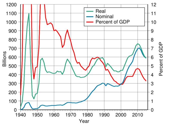 Keywords: United States military spending.svg translate yes en United States military spending from 1940 to 2015 in nominal dollars 2015 dollars and as a percent of GDP During World War II spending reached 37 of GDP in 1944 and during the Korean War reached 13 8 in 1953 Data source https //www whitehouse gov/omb/budget/Historicals Historical tables Table 6 1 2016-05-18 own Delphi234 other versions current annually Generated with Wikimedia SVG Chart SVG Chart/box cc-zero Military of the United States budget |