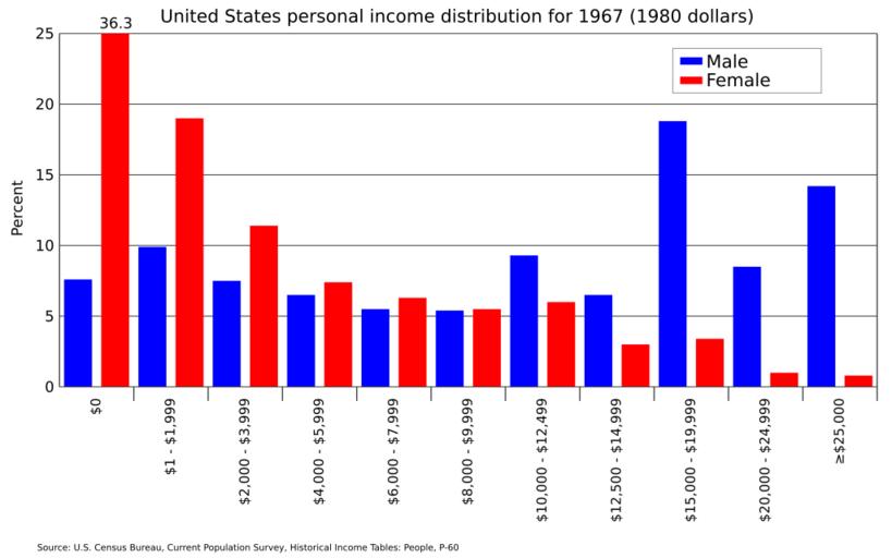 Keywords: United States personal income by sex in 1980 dollars-1967.svg translate yes en Distribution of personal income by sex in the United States in 1967 in 1980 dollars Source U S Census Bureau Current Population Survey Historical Income People https //www2 census gov/prod2/popscan/p60-132 pdf P-60 Table 44 pgs 138-140 2016-05-05 own Delphi234 other versions Note wikitable - 1980 dollars 2014 dollars - 2 000 5 746 - 4 000 11 492 - 6 000 17 238 - 8 000 22 984 - 10 000 28 730 - 12 500 35 913 - 15 000 43 095 - 20 000 57 460 - 25 000 71 825 cc-zero Income distribution in the United States Personal income in the United States |