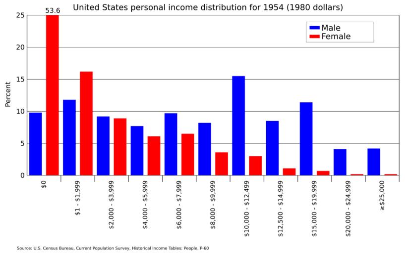 Keywords: United States personal income by sex in 1980 dollars-1954.svg translate yes en Distribution of personal income by sex in the United States in 1954 in 1980 dollars Source U S Census Bureau Current Population Survey Historical Income People https //www2 census gov/prod2/popscan/p60-132 pdf P-60 Table 44 pgs 138-140 2016-05-05 own Delphi234 other versions Note wikitable - 1980 dollars 2014 dollars - 2 000 5 746 - 4 000 11 492 - 6 000 17 238 - 8 000 22 984 - 10 000 28 730 - 12 500 35 913 - 15 000 43 095 - 20 000 57 460 - 25 000 71 825 cc-zero Income distribution in the United States Personal income in the United States |