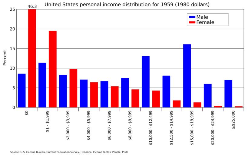 Keywords: United States personal income by sex in 1980 dollars-1959.svg translate yes en Distribution of personal income by sex in the United States in 1959 in 1980 dollars Source U S Census Bureau Current Population Survey Historical Income People https //www2 census gov/prod2/popscan/p60-132 pdf P-60 Table 44 pgs 138-140 2016-05-05 own Delphi234 other versions Note wikitable - 1980 dollars 2014 dollars - 2 000 5 746 - 4 000 11 492 - 6 000 17 238 - 8 000 22 984 - 10 000 28 730 - 12 500 35 913 - 15 000 43 095 - 20 000 57 460 - 25 000 71 825 cc-zero Income distribution in the United States Personal income in the United States |