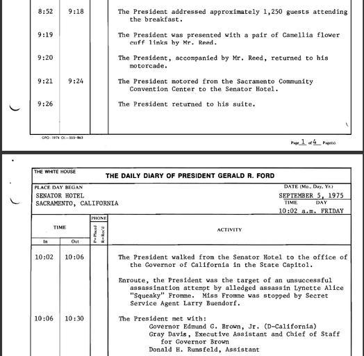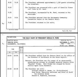 Keywords: United States presidential daily diary, Ford, 19750905 partial.png U S President Gerald Ford cropped September 5 1975 - 8 52 a m to 10 30 a m Location Sacramento California <br><br>The Ford assassination attempt in Sacramento was a September 5 1975 effort by cultist Charles Manson Family member Lynette Squeaky Fromme to kill U S President Gerald Ford in California Ford was in Sacramento that morning to speak at an annual California Host Breakfast The above file is pages from Ford's Daily Diary shows that Ford spoke for 26 minutes at the Host Breakfast and returned to the Senator Hotel He left the Senator Hotel at 10 02 am and walked to the California State Capitol arriving at 10 06 am Between that time the diary notes with little detail that Fromme tried to assassinate Ford Ford himself waited until the end of his meeting with the California Governor to mention that someone had jus tried to kill him The scant text in the September 5 1975 Daily Diary of President Gerald R Ford about the assassination attempt seems to reflect that nonchalant approach by the Ford administration to the assassination attempt 1975-09-05 Gerald R Ford Presidential Library Citation White House September 5 1975 Daily Diary of President Gerald R Ford September 5 1975 President's Daily Diary Collection Box 77 at the Gerald R Ford Presidential Library 12 http //www fordlibrarymuseum gov/library/document/0036/pdd750905 pdf November 27 2012 The White House PD-USGov Institution Institution Gerald R Ford Presidential Museum Gerald R Ford Presidential Library and Museum-cooperation PD-USGov 1975 works in the United States Ford assassination attempt in Sacramento Diary Scanned English texts United States presidential daily diary Ford 1975-09 Documents at the Gerald R Ford Presidential Library and Museum |