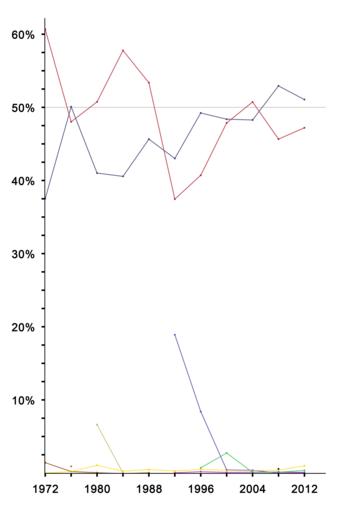 Keywords: United States presidential election results line graph (Expanded).png Key FFD900 Libertarian Party 1px AAAAAA solid 3C3B6E Democratic Party 1px AAAAAA solid B22234 Republican Party 1px AAAAAA solid 884200 American Independent Party 1px AAAAAA solid 827C1D Eugene J McCarthy 1px AAAAAA solid BDB159 National Unity Party John B Anderson 1px AAAAAA solid 6B47AA Ross Perot/Reform Party of the United States of America 1px AAAAAA solid AB37C8 Constitution Party United States 1px AAAAAA solid 27C851 Greens/Green Party USA/Green Party of the United States 1px AAAAAA solid 000000 Ralph Nader other 1px AAAAAA solid Notes <p>Although John B Anderson ultimately declined to run in 1984 the National Unity Party of Kentucky nevertheless placed him on the ballot <p>Although Ross Perot had not yet formed the Reform Party of the United States of America in 1992 his 1992 run is nevertheless displayed above as a Reform Party run <p>Although the Libertarian Party was on the ballot in all fifty United States plus D C in 2000 the Libertarian Party of Arizona due to a conflict with the national party opted to place L Neil Smith on the ballot in place of the national party's nominee Harry Browne The 5 775 votes received by Smith are included in the party's 2000 total <p>The Green Party that nominated candidates for the presidency in 1996 and 2000 was the Greens/Green Party USA The Green Party that nominated candidates for the presidency ever since has been the Green Party of the United States <p>Although Ron Paul did not run in the general elections of 2008 or 2012 supporters nevertheless got his name on the ballot in some states and got him write-in access in others Ron Paul was also the Libertarian Party nominee in 1988 alexpeak com 22 March 2016 allixpeeke 200px Bar graph 350px Expanded bar graph 175px Line graph Cc-zero Category American Independent Party presidential graphs United States presidential election statistics United States presidential election 1972 United States presidential election 1976 United States presidential election 1980 United States presidential election 1984 United States presidential election 1988 United States presidential election 1992 United States presidential election 1996 United States presidential election 2000 United States presidential election 2004 United States presidential election 2008 Libertarian Party presidential graphs United States Libertarian Party 1972 presidential campaign United States Libertarian Party 1976 presidential campaign United States Libertarian Party 1980 presidential campaign United States Libertarian Party 1984 presidential campaign United States Libertarian Party 1988 presidential campaign United States Libertarian Party 1992 presidential campaign United States Libertarian Party 1996 presidential campaign United States Libertarian Party 2000 presidential campaign United States Libertarian Party 2004 presidential campaign United States Libertarian Party 2008 presidential campaign United States Libertarian Party 2012 presidential campaign United States Democratic Party presidential graphs United States United States Democratic Party 1972 presidential campaign United States Democratic Party 1976 presidential campaign United States Democratic Party 1980 presidential campaign United States Democratic Party 1984 presidential campaign United States Democratic Party 1988 presidential campaign United States Democratic Party 1992 presidential campaign United States Democratic Party 1996 presidential campaign Al Gore presidential campaign 2000 United States Democratic Party 2004 presidential campaign United States Democratic Party 2008 presidential campaign United States Democratic Party 2012 presidential campaign Republican Party presidential graphs United States United States Republican Party 1972 presidential campaign United States Republican Party 1976 presidential campaign United States Republican Party 1980 presidential campaign United States Republican Party 1984 presidential campaign United States Republican Party 1988 presidential campaign United States Republican Party 1992 presidential campaign United States Republican Party 1996 presidential campaign George W Bush presidential campaign 2000 George W Bush presidential campaign 2004 United States Republican Party 2008 presidential campaign United States Republican Party 2012 presidential campaign Green Party of the United States presidential graphs Greens/Green Party USA 1996 presidential campaign Greens/Green Party USA 2000 presidential campaign Green Party of the United States 2004 presidential campaign Green Party of the United States 2008 presidential campaign Green Party of the United States 2012 presidential campaign Constitution Party presidential graphs United States U S Taxpayers Party 1992 presidential campaign U S Taxpayers Party 1996 presidential campaign Constitution Party 2000 presidential campaign United States Constitution Party 2004 presidential campaign United States Constitution Party 2008 presidential campaign United States Constitution Party 2012 presidential campaign United States Ralph Nader graphs Ralph Nader presidential campaign 2008 Reform Party of the United States of America presidential graphs Ross Perot presidential campaign 1992 Reform Party of the United States of America 1996 presidential campaign Reform Party of the United States of America 2000 presidential campaign Reform Party of the United States of America 2004 presidential campaign Reform Party of the United States of America 2008 presidential campaign Reform Party of the United States of America 2012 presidential campaign National Unity Party presidential graphs United States Eugene McCarthy presidential graphs Political line charts Electoral timelines of the United States of America Dot charts Gary Johnson graphs |