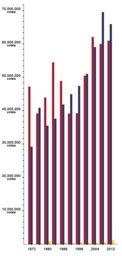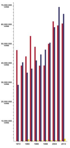 Keywords: United States presidential election raw popular vote count bar graph.png Key FFD900 Libertarian Party 1px AAAAAA solid 3C3B6E Democratic Party 1px AAAAAA solid B22234 Republican Party 1px AAAAAA solid Notes <p>Although the Libertarian Party was on the ballot in all fifty United States plus D C in 2000 the Libertarian Party of Arizona due to a conflict with the national party opted to place L Neil Smith on the ballot in place of the national party's nominee Harry Browne The 5 775 votes received by Smith are included in the party's 2000 total <p>In 2008 the Libertarian Party of New Hampshire had two presidential candidates on the ballot Bob Barr and George Phillies The 531 votes received by Phillies are included in the party's 2008 total alexpeak com 22 March 2016 allixpeeke 350px Expanded bar graph 175px Line graph 175px Expanded line graph Cc-zero United States presidential election statistics United States presidential election 1972 United States presidential election 1976 United States presidential election 1980 United States presidential election 1984 United States presidential election 1988 United States presidential election 1992 United States presidential election 1996 United States presidential election 2000 United States presidential election 2004 United States presidential election 2008 Libertarian Party presidential graphs United States Libertarian Party 1972 presidential campaign United States Libertarian Party 1976 presidential campaign United States Libertarian Party 1980 presidential campaign United States Libertarian Party 1984 presidential campaign United States Libertarian Party 1988 presidential campaign United States Libertarian Party 1992 presidential campaign United States Libertarian Party 1996 presidential campaign United States Libertarian Party 2000 presidential campaign United States Libertarian Party 2004 presidential campaign United States Libertarian Party 2008 presidential campaign United States Libertarian Party 2012 presidential campaign United States Democratic Party presidential graphs United States United States Democratic Party 1972 presidential campaign United States Democratic Party 1976 presidential campaign United States Democratic Party 1980 presidential campaign United States Democratic Party 1984 presidential campaign United States Democratic Party 1988 presidential campaign United States Democratic Party 1992 presidential campaign United States Democratic Party 1996 presidential campaign Al Gore presidential campaign 2000 United States Democratic Party 2004 presidential campaign United States Democratic Party 2008 presidential campaign United States Democratic Party 2012 presidential campaign Republican Party presidential graphs United States United States Republican Party 1972 presidential campaign United States Republican Party 1976 presidential campaign United States Republican Party 1980 presidential campaign United States Republican Party 1984 presidential campaign United States Republican Party 1988 presidential campaign United States Republican Party 1992 presidential campaign United States Republican Party 1996 presidential campaign George W Bush presidential campaign 2000 George W Bush presidential campaign 2004 United States Republican Party 2008 presidential campaign United States Republican Party 2012 presidential campaign Charts in English Charts in French Political bar charts Electoral timelines of the United States of America Gary Johnson graphs |