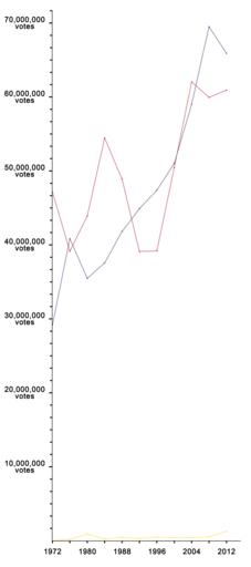 Keywords: United States presidential election raw popular vote count line graph.png Key FFD900 Libertarian Party 1px AAAAAA solid 3C3B6E Democratic Party 1px AAAAAA solid B22234 Republican Party 1px AAAAAA solid Notes <p>Although the Libertarian Party was on the ballot in all fifty United States plus D C in 2000 the Libertarian Party of Arizona due to a conflict with the national party opted to place L Neil Smith on the ballot in place of the national party's nominee Harry Browne The 5 775 votes received by Smith are included in the party's 2000 total <p>In 2008 the Libertarian Party of New Hampshire had two presidential candidates on the ballot Bob Barr and George Phillies The 531 votes received by Phillies are included in the party's 2008 total alexpeak com 22 March 2016 allixpeeke 200px Bar graph 350px Expanded bar graph 175px Expanded line graph Cc-zero United States presidential election statistics United States presidential election 1972 United States presidential election 1976 United States presidential election 1980 United States presidential election 1984 United States presidential election 1988 United States presidential election 1992 United States presidential election 1996 United States presidential election 2000 United States presidential election 2004 United States presidential election 2008 Libertarian Party presidential graphs United States Libertarian Party 1972 presidential campaign United States Libertarian Party 1976 presidential campaign United States Libertarian Party 1980 presidential campaign United States Libertarian Party 1984 presidential campaign United States Libertarian Party 1988 presidential campaign United States Libertarian Party 1992 presidential campaign United States Libertarian Party 1996 presidential campaign United States Libertarian Party 2000 presidential campaign United States Libertarian Party 2004 presidential campaign United States Libertarian Party 2008 presidential campaign United States Libertarian Party 2012 presidential campaign United States Democratic Party presidential graphs United States United States Democratic Party 1972 presidential campaign United States Democratic Party 1976 presidential campaign United States Democratic Party 1980 presidential campaign United States Democratic Party 1984 presidential campaign United States Democratic Party 1988 presidential campaign United States Democratic Party 1992 presidential campaign United States Democratic Party 1996 presidential campaign Al Gore presidential campaign 2000 United States Democratic Party 2004 presidential campaign United States Democratic Party 2008 presidential campaign United States Democratic Party 2012 presidential campaign Republican Party presidential graphs United States United States Republican Party 1972 presidential campaign United States Republican Party 1976 presidential campaign United States Republican Party 1980 presidential campaign United States Republican Party 1984 presidential campaign United States Republican Party 1988 presidential campaign United States Republican Party 1992 presidential campaign United States Republican Party 1996 presidential campaign George W Bush presidential campaign 2000 George W Bush presidential campaign 2004 United States Republican Party 2008 presidential campaign United States Republican Party 2012 presidential campaign Charts in English Charts in French Political line charts Electoral timelines of the United States of America Gary Johnson graphs |