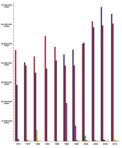 Keywords: United States presidential election raw popular vote count bar graph (Expanded).png Key FFD900 Libertarian Party 1px AAAAAA solid 3C3B6E Democratic Party 1px AAAAAA solid B22234 Republican Party 1px AAAAAA solid FF0000 Communist Party USA 1px AAAAAA solid 884200 American Independent Party 1px AAAAAA solid 827C1D Eugene J McCarthy 1px AAAAAA solid BDB159 National Unity Party John B Anderson 1px AAAAAA solid 6B47AA Ross Perot/Reform Party of the United States of America 1px AAAAAA solid AB37C8 Constitution Party United States 1px AAAAAA solid 27C851 Greens/Green Party USA/Green Party of the United States 1px AAAAAA solid 000000 Ralph Nader other 1px AAAAAA solid F13A8D Ron Paul other 1px AAAAAA solid Notes <p>Although Ross Perot had not yet formed the Reform Party of the United States of America in 1992 his 1992 run is nevertheless displayed above as a Reform Party run <p>Although the Libertarian Party was on the ballot in all fifty United States plus D C in 2000 the Libertarian Party of Arizona due to a conflict with the national party opted to place L Neil Smith on the ballot in place of the national party's nominee Harry Browne The 5 775 votes received by Smith are included in the party's 2000 total <p>In 2008 the Libertarian Party of New Hampshire had two presidential candidates on the ballot Bob Barr and George Phillies The 531 votes received by Phillies are included in the party's 2008 total <p>The Green Party that nominated candidates for the presidency in 1996 and 2000 was the Greens/Green Party USA The Green Party that nominated candidates for the presidency ever since has been the Green Party of the United States <p>Although Ron Paul did not run in the general elections of 2008 or 2012 supporters nevertheless got his name on the ballot in some states and got him write-in access in others Ron Paul was also the Libertarian Party nominee in 1988 alexpeak com 22 March 2016 allixpeeke 200px Bar graph 175px Line graph 175px Expanded line graph Category American Independent Party presidential graphs Cc-zero United States presidential election statistics United States presidential election 1972 United States presidential election 1976 United States presidential election 1980 United States presidential election 1984 United States presidential election 1988 United States presidential election 1992 United States presidential election 1996 United States presidential election 2000 United States presidential election 2004 United States presidential election 2008 Libertarian Party presidential graphs United States Libertarian Party 1972 presidential campaign United States Libertarian Party 1976 presidential campaign United States Libertarian Party 1980 presidential campaign United States Libertarian Party 1984 presidential campaign United States Libertarian Party 1988 presidential campaign United States Libertarian Party 1992 presidential campaign United States Libertarian Party 1996 presidential campaign United States Libertarian Party 2000 presidential campaign United States Libertarian Party 2004 presidential campaign United States Libertarian Party 2008 presidential campaign United States Libertarian Party 2012 presidential campaign United States Democratic Party presidential graphs United States United States Democratic Party 1972 presidential campaign United States Democratic Party 1976 presidential campaign United States Democratic Party 1980 presidential campaign United States Democratic Party 1984 presidential campaign United States Democratic Party 1988 presidential campaign United States Democratic Party 1992 presidential campaign United States Democratic Party 1996 presidential campaign Al Gore presidential campaign 2000 United States Democratic Party 2004 presidential campaign United States Democratic Party 2008 presidential campaign United States Democratic Party 2012 presidential campaign Republican Party presidential graphs United States United States Republican Party 1972 presidential campaign United States Republican Party 1976 presidential campaign United States Republican Party 1980 presidential campaign United States Republican Party 1984 presidential campaign United States Republican Party 1988 presidential campaign United States Republican Party 1992 presidential campaign United States Republican Party 1996 presidential campaign George W Bush presidential campaign 2000 George W Bush presidential campaign 2004 United States Republican Party 2008 presidential campaign United States Republican Party 2012 presidential campaign Green Party of the United States presidential graphs Greens/Green Party USA 1996 presidential campaign Greens/Green Party USA 2000 presidential campaign Green Party of the United States 2004 presidential campaign Green Party of the United States 2008 presidential campaign Green Party of the United States 2012 presidential campaign Constitution Party presidential graphs United States U S Taxpayers Party 1992 presidential campaign U S Taxpayers Party 1996 presidential campaign Constitution Party 2000 presidential campaign United States Constitution Party 2004 presidential campaign United States Constitution Party 2008 presidential campaign United States Constitution Party 2012 presidential campaign United States Ron Paul graphs Ron Paul presidential campaign 2008 Ron Paul presidential campaign 2012 Ralph Nader graphs Ralph Nader presidential campaign 2000 Ralph Nader presidential campaign 2008 Reform Party of the United States of America presidential graphs Ross Perot presidential campaign 1992 Reform Party of the United States of America 1996 presidential campaign Reform Party of the United States of America 2000 presidential campaign Reform Party of the United States of America 2004 presidential campaign Communist Party USA presidential graphs National Unity Party presidential graphs United States Eugene McCarthy presidential graphs Charts in English Charts in French Political bar charts Electoral timelines of the United States of America Gary
