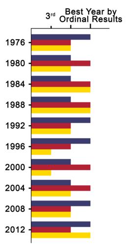 Keywords: United States presidential ordinal interyear intraparty results comparison of ordinal results bar graph.png Key FFD900 Libertarian Party 1px AAAAAA solid 3C3B6E Democratic Party 1px AAAAAA solid B22234 Republican Party 1px AAAAAA solid Notes <p>This graph ordinally charts the various prominent United States of America national parties' various presidential rankings since 1976 in relation to one another as opposed to charting their various presidential rankings in relation to the other United States of America national parties' various presidential rankings For example using this graph one can see that the Libertarian Party had its highest ranking since 1976 in the years 1984 1988 and 2012 it came in third place in those three years or that the Republican Party had its second-highest ranking since 1976 in the years 1976 1992 1996 2008 and 2012 it came in second place in those five years <p>Although this graph compares intraparty ordinal rankings based on percentages of the popular votes the graph deviates from this in that it indicates the Republican Party's 2000 electoral victory over the Democratic Party alexpeak com 22 March 2016 allixpeeke 100px Expanded bar graph Cc-zero United States presidential election statistics United States presidential election 1976 United States presidential election 1980 United States presidential election 1984 United States presidential election 1988 United States presidential election 1992 United States presidential election 1996 United States presidential election 2000 United States presidential election 2004 United States presidential election 2008 Libertarian Party presidential graphs United States Libertarian Party 1976 presidential campaign United States Libertarian Party 1980 presidential campaign United States Libertarian Party 1984 presidential campaign United States Libertarian Party 1988 presidential campaign United States Libertarian Party 1992 presidential campaign United States Libertarian Party 1996 presidential campaign United States Libertarian Party 2000 presidential campaign United States Libertarian Party 2004 presidential campaign United States Libertarian Party 2008 presidential campaign United States Libertarian Party 2012 presidential campaign United States Democratic Party presidential graphs United States United States Democratic Party 1976 presidential campaign United States Democratic Party 1980 presidential campaign United States Democratic Party 1984 presidential campaign United States Democratic Party 1988 presidential campaign United States Democratic Party 1992 presidential campaign United States Democratic Party 1996 presidential campaign Al Gore presidential campaign 2000 United States Democratic Party 2004 presidential campaign United States Democratic Party 2008 presidential campaign United States Democratic Party 2012 presidential campaign Republican Party presidential graphs United States United States Republican Party 1976 presidential campaign United States Republican Party 1980 presidential campaign United States Republican Party 1984 presidential campaign United States Republican Party 1988 presidential campaign United States Republican Party 1992 presidential campaign United States Republican Party 1996 presidential campaign George W Bush presidential campaign 2000 George W Bush presidential campaign 2004 United States Republican Party 2008 presidential campaign United States Republican Party 2012 presidential campaign Political bar charts Charts in English Electoral timelines of the United States of America Gary Johnson graphs |