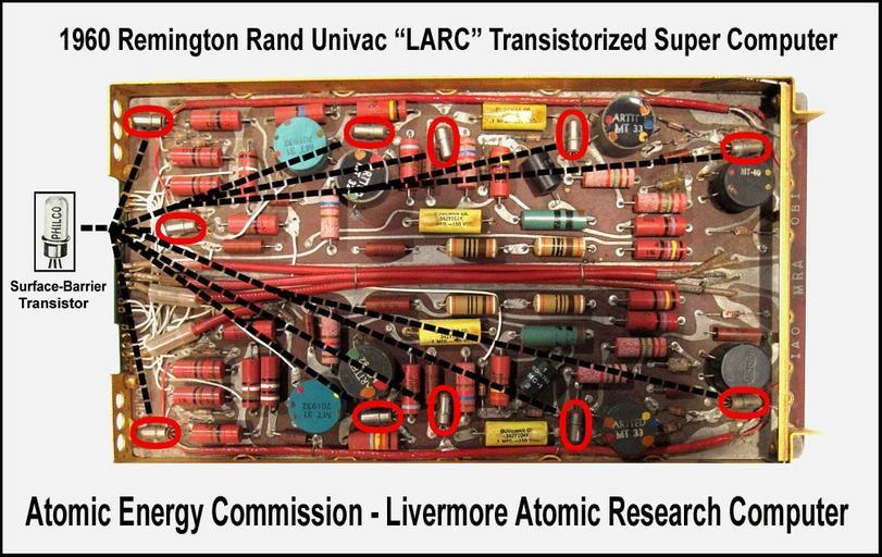 Keywords: Univac LARC supercomputer circuit board=1960.JPG en This is a photo of a memory-read amplifier circuit board card that is from a 1960 Remington Rand Univac LARC transistorized supercomputer The original photo and copyright owner is from the website http //www vintchip com/mainframe/UNIVACLARC/UNIVACLARC html which granted me full permission to use alter or modify this photo on any Wikipedia and Wikimedia pages This original photo was enhanced and modified by me with Adobe Photoshop to show the number and locations of the Philco surface-barrier transistors that were used in this circuit board card 2010-10-04 13 55 13 own Historianbuff cc-by-sa-3 0 Attribution PD-retouched-user FAL Uploaded with UploadWizard UNIVAC |