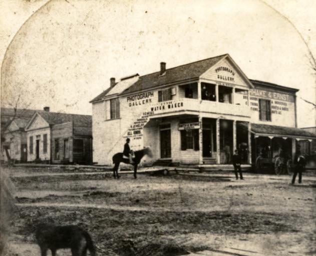 | Keywords: University Ave Hunstville TX 1870s.jpg en Printed photograph of Huntsville Texas showing the corner of Twelfth street and University Avenue The corner building that houses several businesses is centered in the photograph Poe and Wright's Photograph Gallery is located upstairs with a skylight Smith and Wynne Huntsville's first bankers are located downstairs A horse-drawn wagon is stopped in front of the dry goods store next door Unidentified men are standing in front another man is seated on a horse and a dog is standing in the foreground http //digital lib uh edu/u /p15195coll2 110 University of Houston Digital Library s 1870 This image is in the public domain and may be used freely If publishing in print electronically or on a website please use the citation Courtesy of Special Collections University of Houston Libraries To order a higher resolution reproduction see http //info lib uh edu/about/campus-libraries-collections/special-collections-archives/request-digital University of Houston Libraries Huntville Texas Horse transport in Texas Texas in the 1870s |