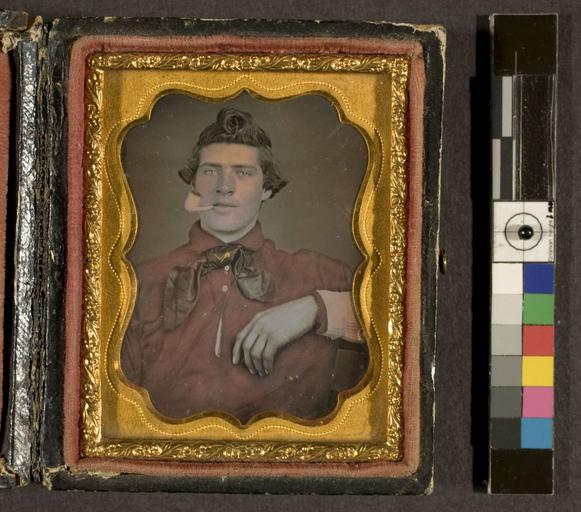 | Keywords: Unknown man.jpg en Portrait of young man in red shirt smoking a clay pipe Digital Accession Number 1995 2739 0001 0001 Maker Unidentified Title Portrait of young man in red shirt smoking a clay pipe Date ca 1850 Medium daguerreotype with applied color Dimensions 5 3 x 3 8 cm ; 1/9 plate George Eastman House Collection http //www flickr com/photos/george_eastman_house/4420693328/ Portrait of young man in red shirt smoking a clay pipe http //www flickr com/photos/7167652 N06 George Eastman House from Rochester NY United States ~ 1850 Flickr-no known copyright restrictions pd-old Óðinn 2010-12-04 Uncategorized 2015 April 29 |