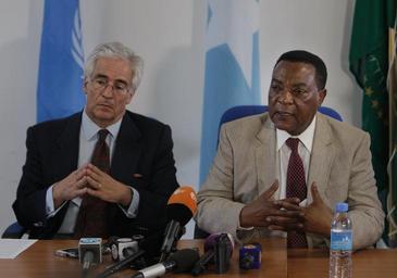 | Keywords: somalia mogadishu politics goverment un mahiga ambassadors transition indoor Augustine Mahiga, Special Representative of the UN Secretary General and head of the UN Political Office in Somalia (UNPOS), right, speaks alongside European Union Special Representative for the Horn of Africa Alexander Rondos on during a press conference 19 August 2012 in the Somali capital Mogadishu. Mahiga and Rondos, along with representatives of the AU, IGAD, Italy, Norway, Turkey, the US and the UK were in Somalia to reaffirm their support for the political process that will see Somalia have its first elected parliament and government in 20 years when the mandate of current Transitional Federal Government (TFG) ends tomorrow on 20 August. AU-UN IST PHOTO / STUART PRICE. Augustine Mahiga, Special Representative of the UN Secretary General and head of the UN Political Office in Somalia (UNPOS), right, speaks alongside European Union Special Representative for the Horn of Africa Alexander Rondos on during a press conference 19 August 2012 in the Somali capital Mogadishu. Mahiga and Rondos, along with representatives of the AU, IGAD, Italy, Norway, Turkey, the US and the UK were in Somalia to reaffirm their support for the political process that will see Somalia have its first elected parliament and government in 20 years when the mandate of current Transitional Federal Government (TFG) ends tomorrow on 20 August. AU-UN IST PHOTO / STUART PRICE. Augustine Mahiga, Special Representative of the UN Secretary General and head of the UN Political Office in Somalia (UNPOS), right, speaks alongside European Union Special Representative for the Horn of Africa Alexander Rondos on during a press conference 19 August 2012 in the Somali capital Mogadishu. Mahiga and Rondos, along with representatives of the AU, IGAD, Italy, Norway, Turkey, the US and the UK were in Somalia to reaffirm their support for the political process that will see Somalia have its first elected parliament and government in 20 years when the mandate of current Transitional Federal Government (TFG) ends tomorrow on 20 August. AU-UN IST PHOTO / STUART PRICE. politics un transition ambassadors somalia goverment mogadishu mahiga |