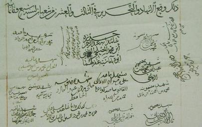 Keywords: Unterschriften.jpg de Unterschriften der Zeugen unter einer Vakfiye Stiftungsurkunde für ein von Mahmud Çelebi gestiftetes Imaret Sie lassen den à bergang von der linearen Schreibweise zu pençe und Tughra erkennen İsmet Keten Mehmet Nuri Şahin u Sıddık Çalık Selçuklu ve beyliklerde vakfiye tuğraları Ankara 2005 S 144 Mehrere Zeugen von 1404 1404 Tughra PD-old-100 |
