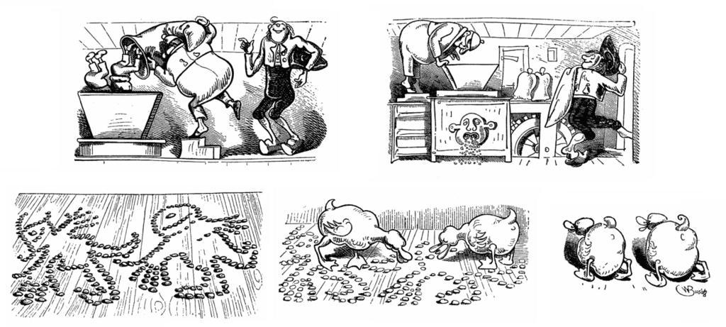 Keywords: Unumkehrbarkeit horizontal.png Wilhelm Busch Ende des letzten Streichs von Max und Moritz <br /> Darstellung eines irreversiblen Prozesses Wilhelm Busch machte durch Einfügung eines Zwischenschrittes die Vergeblichkeit einer Umkehrung der Zerstörung besonders deutlich Eine zufällige Strukturbildung auch noch mit extrem niedriger Auftrittswahrscheinlichkeit bringt noch einmal die Umrisse von Max und Moritz hervor Die Struktur ist aber schon recht weit vom Originalzustand entfernt Aber auch sie findet dann unwiederbringlich ihr Ende in der Ente File Unumkehrbarkeit png File Unumkehrbarkeit png vertikal ; File Unumkehrbarkeit svg vertikal SVG Max und Moritz Busch PD-old |