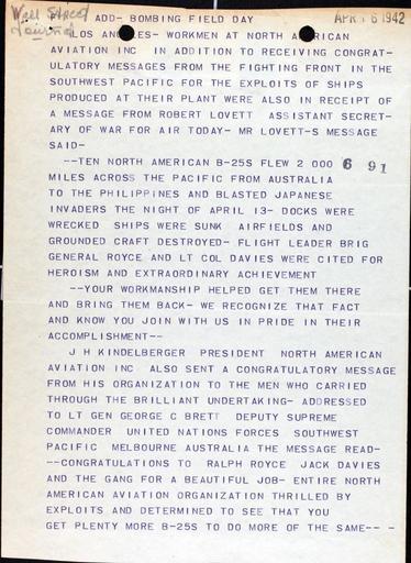 Keywords: doolittle raid doolittleraid united press wire service unitedpresswireservice 1942 world war two worldwartwo document text Photo of a document from the 1942 United Press Wire Service Dispatches Special Collection. Repository: San Diego Air and Space Museum Archive Photo of a document from the 1942 United Press Wire Service Dispatches Special Collection. Repository: San Diego Air and Space Museum Archive |