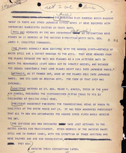 Keywords: doolittle raid doolittleraid united press wire service unitedpresswireservice 1942 world war two worldwartwo text document writing Photo of a document from the 1942 United Press Wire Service Dispatches Special Collection. Repository: San Diego Air and Space Museum Archive Photo of a document from the 1942 United Press Wire Service Dispatches Special Collection. Repository: San Diego Air and Space Museum Archive |