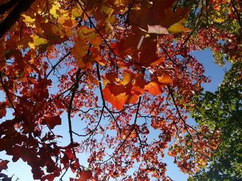 Keywords: up high fall foliage autumn maple leaves red yellow orange crown tree top maple fall leaves leaves golden yellow gold autumn colours fall color foliage nature acer platanoides needle leaf maple deciduous tree acer norway maple