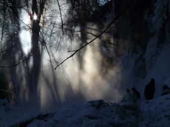 Keywords: urach waterfall back light fog haze winter wintry spray drizzle iced snow mystical ghostly mysterious swabian alb alb alb eaves urach