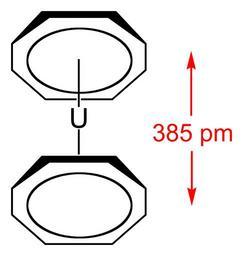 Keywords: Uranocene-385pm.png Skeletal formula of the uranocene molecule C<sub>8</sub>H<sub>8</sub> <sub>2</sub>U with the distance 385 pm between the planes of the two rings indicated own Benjah-bmm27 Benjah-bmm27 Uranocene