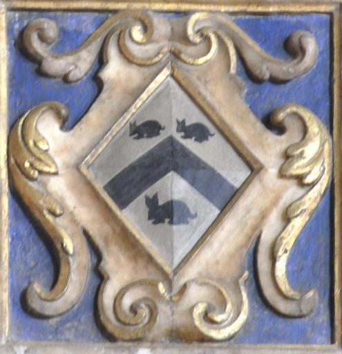 | Keywords: UrsulaStrodeArmsBishopsTawton.JPG en Arms of Strode of Newnham Plympton St Mary Devon Argent a chevron between three conies courant sable Detail from mural monument to Ursula Strode d 1635 1st wife of Sir John III Chichester d 1669 of Hall Bishop's Tawton Devon and daughter of Sir William Strode d 1637 MP South wall of chancel Bishop's Tawton Church Devon own photo Lobsterthermidor <span class signature-talk >talk</span> 17 09 4 April 2013 UTC Sculpture/painting 1635; photo 2013 Conies in heraldry St John the Baptist Church Bishop's Tawton interior Reliefs of coats of arms in England Strode arms Lozenge-shaped heraldic shields Wall mounted church monuments in Devon |