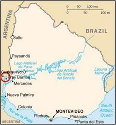 Keywords: Uruguay - Plantas de celulosa.jpg Uruguay map with cellulose plants area marked http //es wikipedia org/wiki/Imagen Uruguay_mapa png 2006-05-18 Pepe Robles over uruguay_mapa png own work over public domain map Uruguay Pulp mill conflict between Argentina and Uruguay Fray Bentos UPM paper mill |