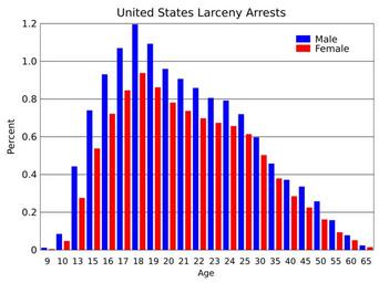 Keywords: US arrests for larceny by age.svg translate yes en Arrests in the United States for larceny in 2014 by age Data from https //www fbi gov/about-us/cjis/ucr/crime-in-the-u s/2014/crime-in-the-u s -2014/tables/table-39 UCR own Delphi234 2016-05-23 Cc-zero Arrest statistics for the United States SVG bar charts Histograms |