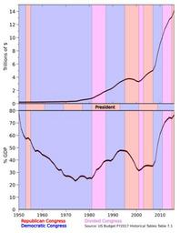 Keywords: US Debt Trend-Congress.svg en Time series of U S public debt overlaid with partisan affiliation of the Congress and the White House The upper graph shows the U S public debt in trillions of USD while the lower graph shows the U S public debt as a percentage of GDP Debt for 2016 is estimated Data is from the FY 2017 U S Budget report https //www gpo gov/fdsys/search/pagedetails action granuleId BUDGET-2017-TAB-8-1 packageId BUDGET-2017-TAB Table 7 1 2016-03-26 own Delphi234 other versions File US Debt Trend svg current annually cc-zero Economy of the United States Government debt Government of the United States United States Congress Presidents of the United States |