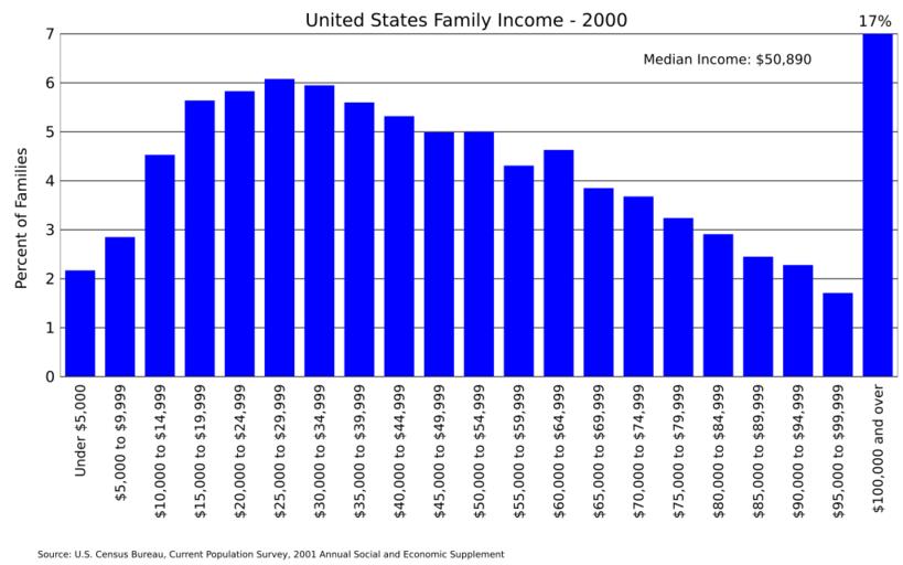 Keywords: US family income 2000.svg en United States family income distribution for 2000 Data from US Census https //www census gov/data/tables/time-series/demo/income-poverty/cps-finc/finc-01 html FINC-01 2016-06-16 own Delphi234 other versions cc-zero Income distribution in the United States |