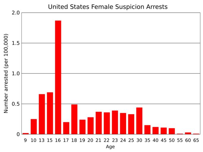 Keywords: US female arrests for suspicion by age.svg translate yes en Arrests in the United States of females for suspicion in 2014 by age Data from https //www fbi gov/about-us/cjis/ucr/crime-in-the-u s/2014/crime-in-the-u s -2014/tables/table-40 UCR 2016-05-25 own Delphi234 other versions cc-zero Arrest statistics for the United States SVG bar charts Histograms |