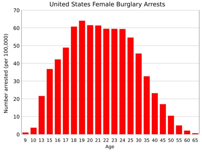 Keywords: US female arrests for burglary by age.svg translate yes en Arrests in the United States of females for burglary in 2014 by age Data from https //www fbi gov/about-us/cjis/ucr/crime-in-the-u s/2014/crime-in-the-u s -2014/tables/table-40 UCR own Delphi234 2016-05-23 Cc-zero Arrest statistics for the United States SVG bar charts Histograms |