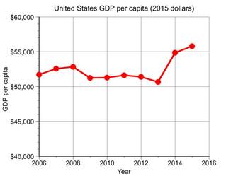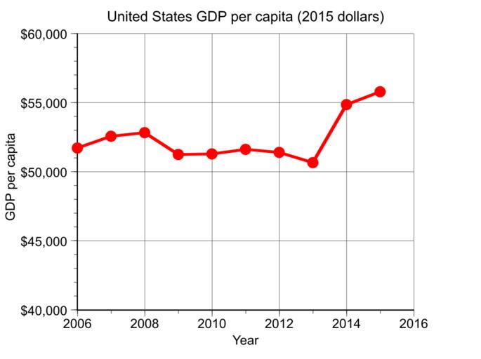 Keywords: US GDP per capita.svg en GDP per capita of the United States in constant 2015 dollars Data from CIA https //www cia gov/library/publications/the-world-factbook/rankorder/2004rank html World Factbook 2016-06-03 own Delphi234 other versions current annually Generated with Wikimedia SVG Chart SVG Chart/box Data wikitable sortable - Year GDP per capita In 2015 dollars - 2006 44 000 51 730 - 2007 46 000 52 584 - 2008 48 000 52 841 - 2009 46 400 51 262 - 2010 47 200 51 304 - 2011 49 000 51 631 - 2012 49 800 51 410 - 2013 49 800 50 668 - 2014 54 800 54 865 - 2015 55 800 55 800 cc-zero Gross domestic product of the United States |