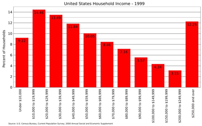 Keywords: US household income 1999.svg en US household income distribution for 1999 Data from https //www census gov/hhes/www/income/data/incpovhlth/1999/index html Money Income in the United States 1999 2016-03-15 own Delphi234 other versions cc-zero Income distribution in the United States |