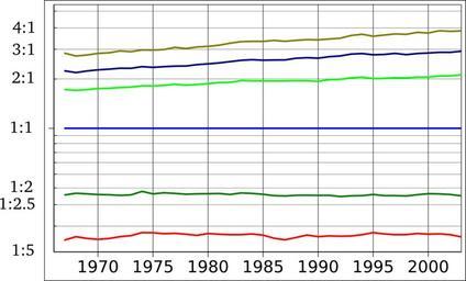 | Keywords: US Income Inequality 1967-2003 relative to median (log scale).svg US income by percentile relative to median 1967 “2003 log chart own ; graphed in Gnumeric labels added in Inkscape Created with Inkscape 2010-03-05 Nils R Barth w File United States Income Distribution 1967-2003 svg “ same data source but raw dollar figures not ratios Data source The data source is cite web http //www census gov/prod/2004pubs/p60-226 pdf Table A-3 Selected Measures of Household Income Dispersion 1967 to 2003 2007-06-16 2004 08 DeNavas-Walt Carmen Bernadette D Proctor Robert J Mills PDF Income Poverty and Health Insurance Coverage in the United States 2003 U S Census Bureau 36-37 English Income Poverty and Health Insurance Coverage in the United States 2003 Carmen DeNavas-Walt Bernadette D Proctor Robert J Mills August 2004 U S Census Bureau U S Department of Commerce Table A-3 Selected Measures of Household Income Dispersion 1967 to 2003 pages 36-37 Household Income at Selected Percentiles Percentile median Year 10th 20th 50th 80th 90th 95th 1967 7790 14002 33338 55265 70443 88678 1968 8472 14912 34746 56937 71799 89076 1969 8600 15369 36074 59772 76117 93743 1970 8435 15126 35832 60148 76719 95090 1971 8446 14927 35463 59708 76599 94818 1972 9009 15434 36953 62878 80793 101215 1973 9314 15844 37700 64500 82360 102243 1974 9401 16064 36537 63477 81577 101433 1975 9125 15143 35559 61765 78652 98484 1976 9168 15615 36155 63247 80701 100839 1977 9259 15573 36359 64564 81742 104377 1978 9745 16398 38693 67874 87110 109348 1979 9589 16457 38649 68318 88588 111445 1980 9515 15977 37447 67028 86692 108894 1981 9280 15772 36868 66878 86401 108822 1982 9216 15548 36811 66920 87717 111516 1983 9167 15769 36593 68154 88712 113187 1984 9542 16175 37767 70092 92299 117253 1985 9583 16306 38510 71433 93483 119459 1986 9526 16586 39868 73853 97043 125264 1987 9452 16724 40357 74893 98333 125321 1988 9817 17006 40678 75593 101339 127958 1989 10315 17329 41411 76946 103865 131443 1990 9965 17059 40865 75341 101857 129307 1991 9776 16580 39679 74759 100833 126969 1992 9655 16190 39364 74533 101023 127230 1993 9635 16256 39165 75594 103010 131178 1994 9914 16484 39613 77154 104890 134835 1995 10501 17261 40845 78061 106436 135448 1996 10474 17239 41431 79395 108450 139541 1997 10588 17601 42294 81719 112241 144636 1998 10979 18164 43825 84529 114396 148995 1999 11420 18915 44922 87459 118969 156744 2000 11304 19142 44853 87341 119636 155121 2001 11105 18674 43882 86771 118080 156395 2002 10863 18326 43381 85941 116726 153438 2003 10536 17984 43318 86867 118200 154120 Economic trends Income distribution in the United States cc-zero |