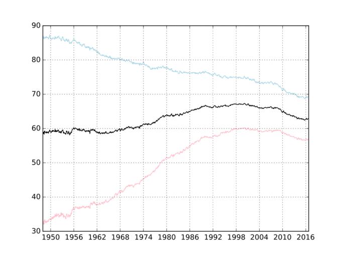 | Keywords: US Labor Participation Rate by gender.svg validSVG en Graph of US Civilian Labor Participation Rate from 1948 to 2011 by gender Men are represented in light blue women in pink and the total in black Bureau of Labor Statistics within the United States Department of Labor User Int21h 2011-10-08 cc-zero thumbthumb Source code <source lang python > /usr/bin/env python Create an SVG graph of BLS timeseries data using matplotlib and BeautifulSoup import matplotlib figure import datetime import bs4 import matplotlib backends backend_cairo import string import urllib2 def main url 'http //data bls gov/timeseries/ s years_option specific_years include_graphs true to_year 2011 from_year 1948' total_series 'LNS11300000' men_series 'LNS11300001' women_series 'LNS11300002' fig ax init_figure add_plot ax scrape_bls bs4 BeautifulSoup urllib2 urlopen url total_series 'black' add_plot ax scrape_bls bs4 BeautifulSoup urllib2 urlopen url men_series 'lightblue' add_plot ax scrape_bls bs4 BeautifulSoup urllib2 urlopen url women_series 'pink' save_figure fig 'US Labor Participation Rate 1948-2011 by gender svg' Scrape the BLS soup for the data def scrape_bls soup table soup find_all 'table' attrs 'class' 'regular-data' assert len table 1 table table0 data years_lc t for t in r if type t is bs4 element Tag for r in table contents4 if type r is bs4 element Tag for row in years_lc year int row0 text months float t text for t in row1 if any c in string printable and c ' ' for c in t text data append year months return data Add plot to figure Extra parameters are passed to matplotlib axes Axes plot def add_plot axis data args x y for year months in data for month n in enumerate months x append datetime date year month+1 1 y append n axis plot x y args Initialize figure def init_figure figure matplotlib figure Figure axis figure add_subplot 111 axis xaxis set_major_locator matplotlib dates YearLocator 6 axis xaxis set_major_formatter matplotlib dates DateFormatter ' Y' axis grid True return figure axis Save figure def save_figure figure filename figure canvas matplotlib backends backend_cairo FigureCanvasCairo figure figure savefig filename transparent True if __name__ __main__ main </source> Labour Economic information graphics Economy of the United States SVG charts in English Sociological trend graphs |