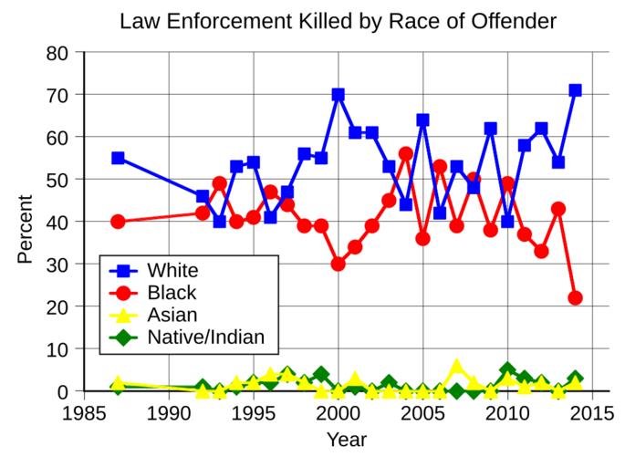 | Keywords: US Law Enforcement Killed by Race of Offender.svg translate yes en United States law enforcement homicides by known race of offender 95 were male 53 were white and 41 black from 1987 to 2014 Data point for 1987 is an average for 1987-1991 Data from https //www fbi gov/about-us/cjis/ucr/leoka Uniform Crime Reports 2016-07-13 own Delphi234 other versions Generated with Wikimedia SVG Chart SVG Chart/box cc-zero Homicide statistics Police of the United States | ||||
