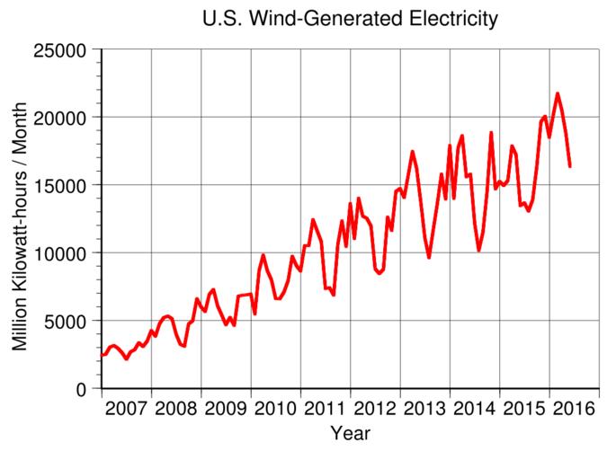 Keywords: US Monthly Wind Generated Electricity.svg translate yes en United States monthly wind generated electricity Data from EIA Electric Power Monthly http //www eia gov/electricity/monthly/epm_table_grapher cfm t epmt_1_01_a Table 1 1 A 2015-01-08 own Delphi234 current monthly Generated with Wikimedia SVG Chart 0 s cc-zero Wind energy statistics of the United States |