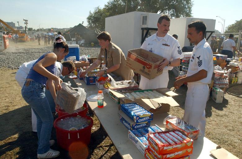 Keywords: US Navy 010912-N-3235P-005 Military members keep food and beverages stocked.jpg en Arlington Va Sept 12 2001 -- Aerographer's Mate Chief Selectee Robert Pitchi far right and Aerographers Mate Petty Officer 1st Class Paul McKenna center both assigned to the Naval Ice Center stock food and beverages for distribution among the hundreds of rescue workers at the Pentagon Sailors Marines Soldiers and Airmen have been on the scene of the terrorist attack since it occurred on Sep 11 when a hijacked commercial airliner was flown into the southern side of the Pentagon U S Navy photo by Photographer's Mate 1st Class Michael W Pendergrass RELEASED 2001-09-12 010912-N-3235P-005 Navy http //www navy mil/view_image asp id 2450 U S Navy photo by Photographer's Mate 1st Class Michael W Pendergrass PD-USGov-Military-Navy September 2001 photographs Aerographer's Mate People of the United States in 2001 The Pentagon on 12 September 2001 Photographs by Michael W Pendergrass |