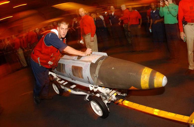 | Keywords: US Navy 011017-N-2383B-508 First use of JDAMs in Afghanistan.jpg en Aboard USS Theodore Roosevelt CVN 71 Oct 17 2001 -- An Aviation Ordnanceman pushes a 2000-lb JDAM GPS-guided bomb that will be used to strike targets in Afghanistan These will be the first bombs deployed by the Theodore Roosevelt in support of Operation Enduring Freedom U S Navy photo by Photographer's Mate Chief Johnny Bivera Fleet Combat Camera Atlantic RELEASED 2001-10-17 011017-N-2383B-508 Navy http //www navy mil/view_image asp id 1504 U S Navy photo by Photographer's Mate Chief Johnny Bivera Fleet Combat Camera Atlantic PD-USGov-Military-Navy USS Theodore Roosevelt CVN-71 hangar deck Aviation Ordnanceman Joint Direct Attack Munition United States Navy in the War in Afghanistan 2001-present Weapons of the War in Afghanistan 2001-present War in Afghanistan 2001-present related operations outside of Afghanistan Photographs taken on 2001-10-17 |