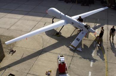 Keywords: US Navy 011109-F-4884R-004 UAV Predator.jpg en Operation Enduring Freedom Nov 9 2001 -- Members of the 11th Reconnaissance Squadron Indian Springs Nev preform pre-flight checks on the Predator prior to a mission The 11th are deployed to perform maintenance on the aircraft in support of Operation Enduring Freedom U S Air Force photo by Tech Sgt Scott Reed RELEASED 2001-11-09 011109-F-4884R-004 Navy http //www navy mil/view_image asp id 2066 U S Navy photo PD-USGov-Military-Navy Operation Enduring Freedom in 2001 11-09 General Atomics MQ-1 Predator Pre-flight checks US Navy |