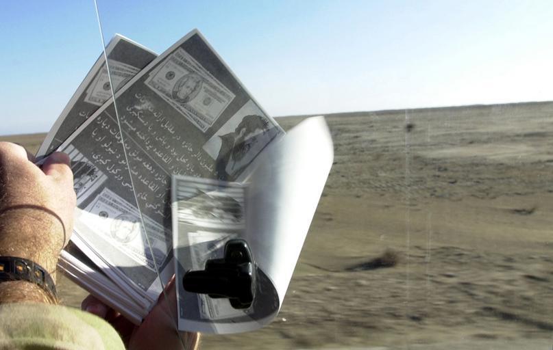 | Keywords: US Navy 011218-F-3961R-003 Army Civial Affairs distibute leaflets in their serach for Osama Bin Laden.jpg en Mazar-e Sharif Afghanistan Dec 18 2001 -- US Army Civil Affairs soldiers distribute leaflets announcing the bounty on Osama Bin Laden's head U S Navy Photo by Staff Sgt Cecilio Ricardo USAF RELEASED 2001-12-18 011218-F-3961R-003 Navy http //www navy mil/view_image asp id 2062 U S Navy Photo by Staff Sgt Cecilio Ricardo USAF PD-USGov-Military-Navy December 2001 in Afghanistan Civil Affairs Hand bills Mazar-e-Sharif United States Army in the War in Afghanistan 2001-present Documents associated with the War in Afghanistan 2001-present Psychological operations in the War in Afghanistan 2001-present December 2001 photographs Military people in 2001 Desert Camouflage Uniform in 2001 18 December Photos taken with Nikon D1 |
