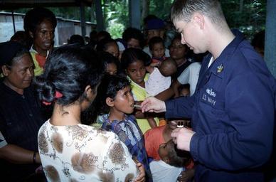 Keywords: US Navy 020313-N-3429E-002 East Timor - humanitarian.jpg en Dili East Timor Mar 13 2002 -- Hospital Corpsman 1st Class Geoff Barker from San Francisco CA gives medication to a child during a medical dental community assistance project MEDCAP/DENCAP Petty Officer Barker is stationed aboard USS Blue Ridge LCC 19 and is part of a nine person MEDCAP team treating patients in the Dili area USS Blue Ridge is underway in the South Pacific U S Navy photo by Photographer's Mate 3rd Class Kurt Eischen RELEASED 2002-03-13 020313-N-3429E-002 Navy http //www navy mil/view_image asp id 1000 U S Navy photo by Photographer's Mate 3rd Class Kurt Eischen PD-USGov-Military-Navy 2002 in Florida March 2002 photographs March 2002 in Asia Military people in 2002 Hospital Corpsman Military people of the United States with children 13 March Aboard USNS Mercy T-AH-19 Healthcare in East Timor Aboard USS Blue Ridge LCC-19 Images from US Navy location Dili East Timor Personality rights |