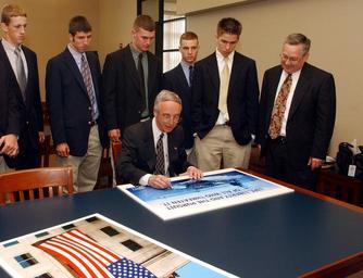 | Keywords: US Navy 020503-N-5636P-002 Secretary of the Navy.jpg Mount St Joseph High School Baltimore MD May 3 2002 -- Secretary of the Navy the Honorable Gordon R England seated signs a Navy recruiting poster at his high school alma mater Mount St Joseph High School In attendance are students and the school President Brother James Kelly far right Secretary England encouraged the all male student body to make the most of their present educational opportunity He also challenged them to use their education as a springboard to serving their country in the future Mount St Joseph High School is a Catholic all-boys college preparatory school that serves the greater Baltimore metropolitan area U S Navy photo by Chief Photographer s Mate Dolores L Parlato RELEASED 2002-05-03 020503-N-5636P-002 Navy http //www navy mil/view_image asp id 1435 U S Navy photo by Chief Photographer s Mate Dolores L Parlato PD-USGov-Military-Navy 2002 in Baltimore May 2002 photographs 3 May Fashion in 2002 Gordon R England 20030502 May 2002 in the United States Men of the United States High schools in Maryland Images from US Navy location BALTIMORE Md Military recruitment posters from the United States People from Baltimore Maryland Politicians giving autographs People in 2002 Photographs of sitting men Photographs of standing men Roman Catholic Archdiocese of Baltimore Roman Catholic monks Standing adolescent boys Students in Maryland Taken with Nikon D1H United States Navy recruitment Personality rights |