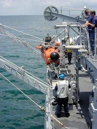 | Keywords: US Navy 020722-N-5745B-003 Mine countermeasures training.jpg en At sea aboard USS Champion MCM 4 Jul 22 2002 -- Sailors aboard the mine countermeasures ship prepare to lower the AN/SLQ-48 Mine Neutralization Vehicle into the water The remotely operated vehicle uses sonar and video cameras to find and identify underwater objects If the operators find a mine the vehicle can place small explosive charges near the mine to neutralize it USS Champion is participating in Gulf of Mexico Exercise 02-2 near Corpus Christi TX During the exercise USS Champion was tasked with searching for and clearing exercise mines from critical waterways in the area U S Navy photo by Lieutenant Marc Boyd RELEASED 2002-07-22 020722-N-5745B-003 Navy http //www navy mil/view_image asp id 2038 U S Navy photo by Lieutenant Marc Boyd PD-USGov-Military-Navy USS Champion MCM-4 AN/SLQ-48 Mine Neutralization Vehicle July 2002 photographs |