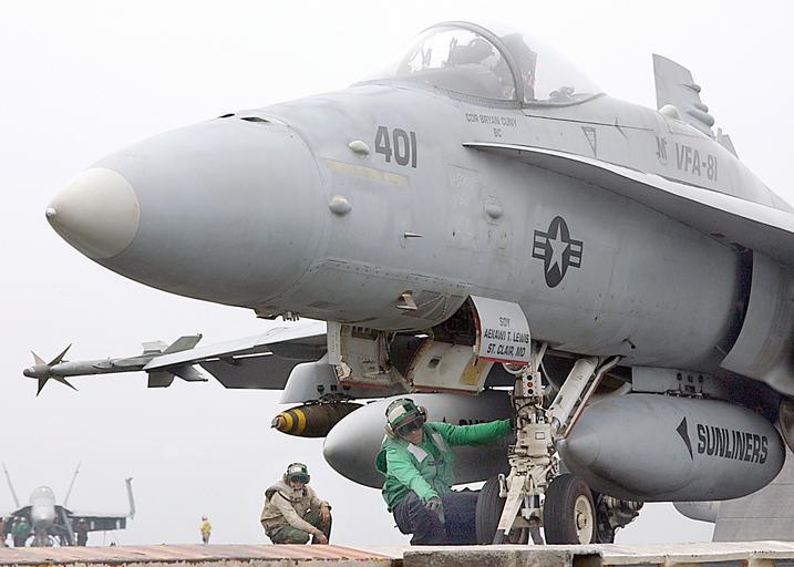 Keywords: US Navy 020806-N-6747H-001 An F-A-18 Hornet strike fighter is made ready for a catapult launch.jpg en At sea aboard USS George Washington CVN 73 Aug 6 2002 -- Airman Victor Fernandez a native of Puerto Rico attaches a launch bar to the catapult shuttle for an F/A-18 Hornet assigned to the Sunliners of Strike Fighter Squadron Eight One VFA 81 during sustained flight operations in support of Operation Enduring Freedom The Norfolk Va based aircraft carrier and her embarked Carrier Air Wing One Seven CVW-17 are on a regularly scheduled deployment Carriers allow the United States to bring air power where it's needed when it's needed and for as long as it's needed without requiring any basing permission from another country U S Navy photo by Photographer's Mate 3rd Class Heather Hess RELEASED 2002-08-06 020806-N-6747H-001 Navy http //www navy mil/view_image asp id 2194 U S Navy photo by Photographer's Mate 3rd Class Heather Hess PD-USGov-Military-Navy August 2002 photographs 6 August August 2002 in the United States Aboard USS George Washington CVN-73 F/A-18 Hornet on flight decks Strike Fighter Squadron 81 United States Navy |