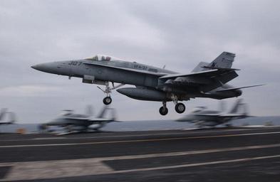 Keywords: US Navy 021025-N-4953E-003 An F-A 18 'Hornet' assigned to the 'Ragin Bulls' of Strike Fighter Squadron Three Seven (VFA-37), performs a 'touch and go' on the ship's flight deck.jpg en At sea aboard USS Harry S Truman CVN 75 -- An F/A 18 Hornet assigned to the Ragin Bulls of Strike Fighter Squadron Three Seven VFA-37 performs a touch and go on the ship s flight deck Truman and Carrier Air Wing Three CVW-3 are participating in a Joint Task Force Exercise JTFEX preparing for their upcoming scheduled six-month deployment U S Navy photo by Photographer's Mate 3nd Class Danny Ewing Jr 021025-N-4953E-003 Navy http //www navy mil/view_image asp id 3152 U S Navy photo PD-USGov-Military-Navy Touch-and-go Aboard USS Harry S Truman CVN-75 F/A-18 Hornet in flight Strike Fighter Squadron 37 United States Navy Photographs by Danny Ewing Jr |