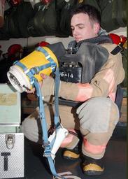 Keywords: US Navy 021112-N-6817C-001 Damage Controlman inspects the Naval Firefighting Thermal Imaging (NFTI).jpg en At sea aboard USS Abraham Lincoln CVN 72 Nov 11 2002 -- Damage Controlman Fireman Justin Suhaskumar from Carrollton Texas inspects the Naval Firefighting Thermal Imaging NFTI device before conducting training drills Fireman Suhaskumar is a member of the Flying Squad aboard Abraham Lincoln The Flying Squad consists of a team of Sailors trained to respond to any fire flooding or damage aboard the aircraft carrier The Lincoln and Carrier Air Wing Fourteen CVW-14 are on a regularly scheduled six-month deployment conducting combat missions in support of Operation Enduring Freedom and Operation Southern Watch U S Navy photo by Photographer's Mate 3rd Class Tyler Clements RELEASED 2002-11-11 021112-N-6817C-001 Navy http //www navy mil/view_image asp id 3333 U S Navy photo by Photographer's Mate 3rd Class Tyler Clements PD-USGov-Military-Navy Aboard USS Abraham Lincoln CVN-72 EEV P4428 Damage Controlman |