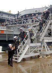 Keywords: US Navy 021220-N-4374S-006 Sailors cross the brow.jpg en Norfolk Va Dec 20 2002 -- Sailors cross the brow as they depart USS George Washington CVN 73 at Naval Station Norfolk During the deployment George Washington launched approximately 10 000 sorties which included offensive strike missions to dislodge Taliban and Al-Qaida operatives In August George Washington and Normandy were in the Arabian Gulf in support of Operation Southern Watch enforcing the southern no-fly zone over Iraq Carrier Air Wing 17 sorties marked the first time in a year that aircraft launched from a U S carrier patrolled the skies over Iraq in conjunction with other coalition aircraft U S Navy photo by Photographer s Mate Michael Sandberg RELEASED 2002-12-20 021220-N-4374S-006 Navy http //www navy mil/view_image asp id 3805 U S Navy photo by Photographer s Mate Michael Sandberg PD-USGov-Military-Navy Naval Station Norfolk Aboard USS George Washington CVN-73 |