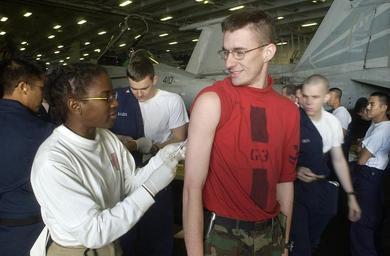Keywords: US Navy 030106-N-4142G-006 Lieutenant Erika Walker of San Diego, CA. administers Aviation Ordinanceman Second Class Darrin Anderson of Plainfield, IL. the first shot of Bacillusanthracis to help build his immune system to Anthr.jpg en At sea aboard USS Constellation CV 64 Jan 6 2003 - Lt Erika Walker administers Aviation Ordnanceman 2nd Class Darrin Anderson the first shot of Bacillusanthracis to help build his immune system to Anthrax Constellation is on a regularly scheduled six-month deployment conducting combat missions in support of Operation Enduring Freedom U S Navy photo by Photographer s Mate 2nd Class Felix Garza Jr RELEASED 2003-01-06 030106-N-4142G-006 Navy http //www navy mil/view_image asp id 3939 U S Navy photo by Photographer s Mate 2nd Class Felix Garza Jr PD-USGov-Military-Navy Aboard USS Constellation CV-64 People being vaccinated January 2003 photographs Photographs by Felix Garza Jr |