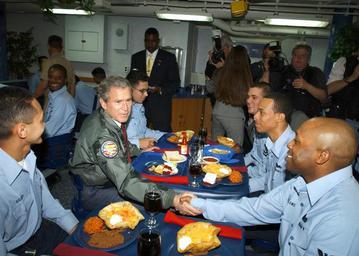 Keywords: US Navy 030213-N-0874H-004 Presiden Bush has lunch with Sailors aboard USS Philippine Sea.jpg en Aboard USS Philippine Sea CG 58 Feb 13 2002 -- While visiting Naval Station Mayport Fla President George W Bush has lunch with Sailors stationed aboard the guided missile cruiser USS Philippine Sea During a speech earlier in the day President Bush thanked Sailors and their families for their sacrifices and the continuing effort with the global war on terror The United States Navy carries the might and the mission of America to the farthest parts of the world the President said U S Navy Photo by Photographer s Mate 2nd Class Chuck Hill RELEASED 2002-02-13 030213-N-0874H-004 Navy http //www navy mil/view_image asp id 4524 U S Navy Photo by Photographer s Mate 2nd Class Chuck Hill PD-USGov-Military-Navy Aboard USS Philippine Sea CG-58 George W Bush in 2003 Handshakes involving the military |