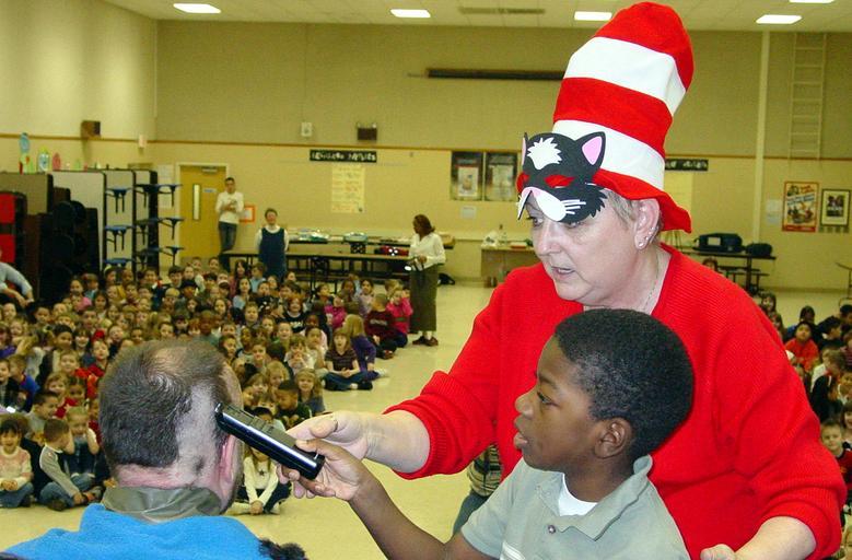 | Keywords: US Navy 030303-N-5698F-001 Read Across America annual celebrations Keflavic Iceland.and.jpg en Naval Air Station Keflavik Iceland Mar 3 2003 -- A second grade student assisted by kindergarten teacher Cheryl Stevens takes the barber clippers to Principal Richard Alix's hair at the Department of Defense Schools DODS A T Mahan Elementary School The school celebrated Read Across America the annual celebration marking the anniversary of the birth of author Dr Seuss Principal Alix challenged his students promising that if they collectively read 500 000 pages before the March deadline he would let them shave his head and beard The students at A T Mahan Elementary read 561 989 pages Principal Alix made good on his promise U S Navy photo by Chief Journalist ret Art Frith RELEASED 2003-03-03 030303-N-5698F-001 Navy http //www navy mil/view_image asp id 5042 U S Navy photo by Chief Journalist ret Art Frith PD-USGov-Military-Navy Naval Air Station Keflavik Dr Seuss |